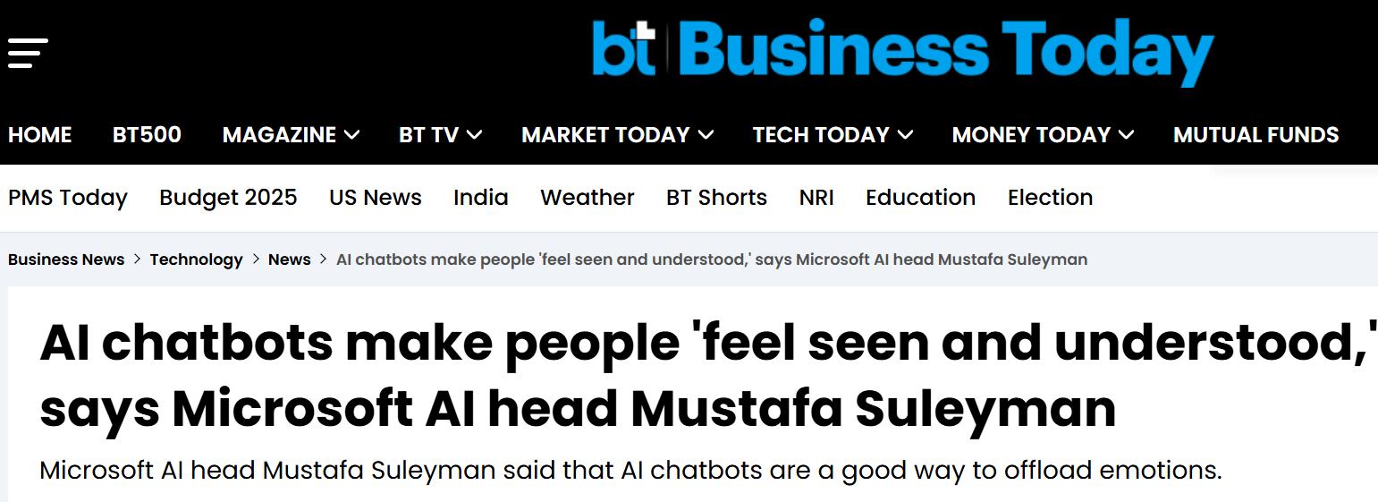 【环球网科技综合报道】12月24日消息,据businesstoday报道称,微软人工智能部门负责人穆斯塔法·苏莱曼(Mustafa Suleyman)近日表示,人工智能聊天机器人正迅速成为全球用户寻求陪伴与情感支持的重要渠道。他指出,从处理分手情绪到调解家庭矛盾,人们正广泛利用AI进行非正式心理疏导,并从中获得“被看见、被理解”的体验。