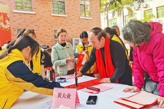 活动秉持“以笔墨承载文化,以春联传递温情”的理念,将为民办实事落到实处。现场书写的千余副春联和“福”字,免费赠送给在校师生、离退休人员和周边社区居民。来自贵港校区食堂的工作人员李师傅拿到春联后高兴地说:“往年都是买印刷的春联,今年能拿到手写的,感觉年味更浓了。”